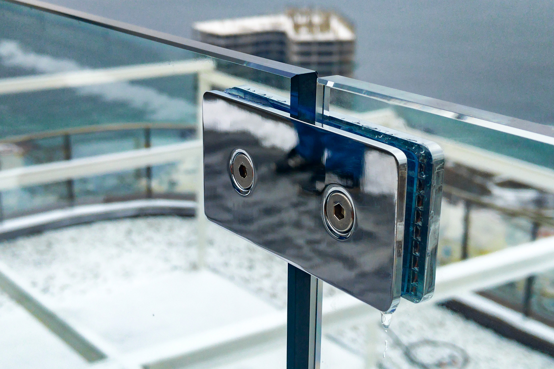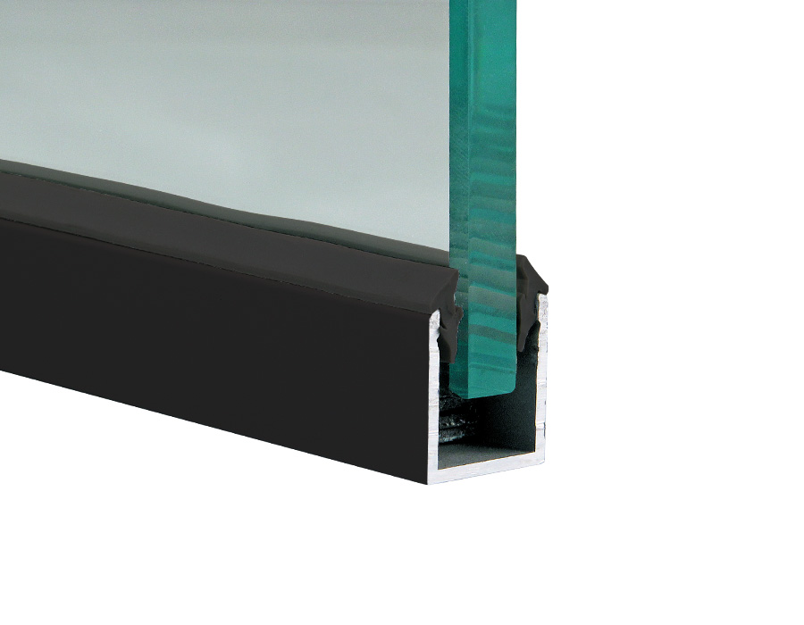 Крепление стекол производится при помощи верхнего зажимного профиля и П-образного профиля, закрепленного в пол. По вертикали, при необходимости, стекла между собой соединяются при помощи коннекторов.