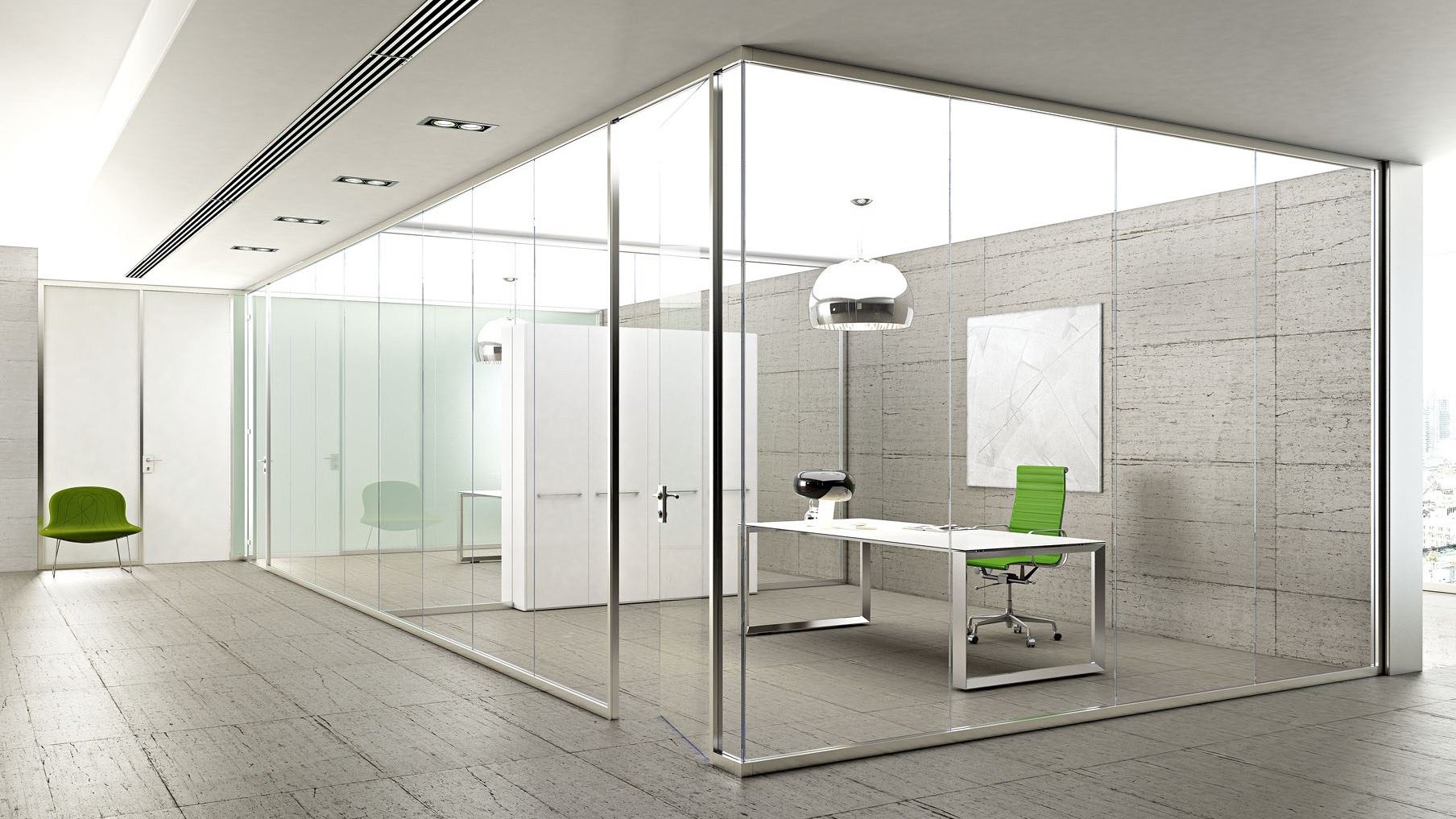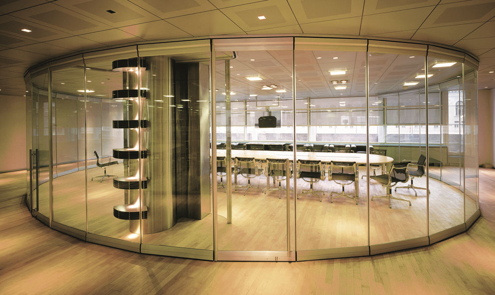 Цельностеклянные перегородки могут быть укомплектованы дверями маятникого типа, раздвижными или дверями в металлическом профиле.