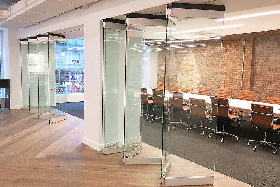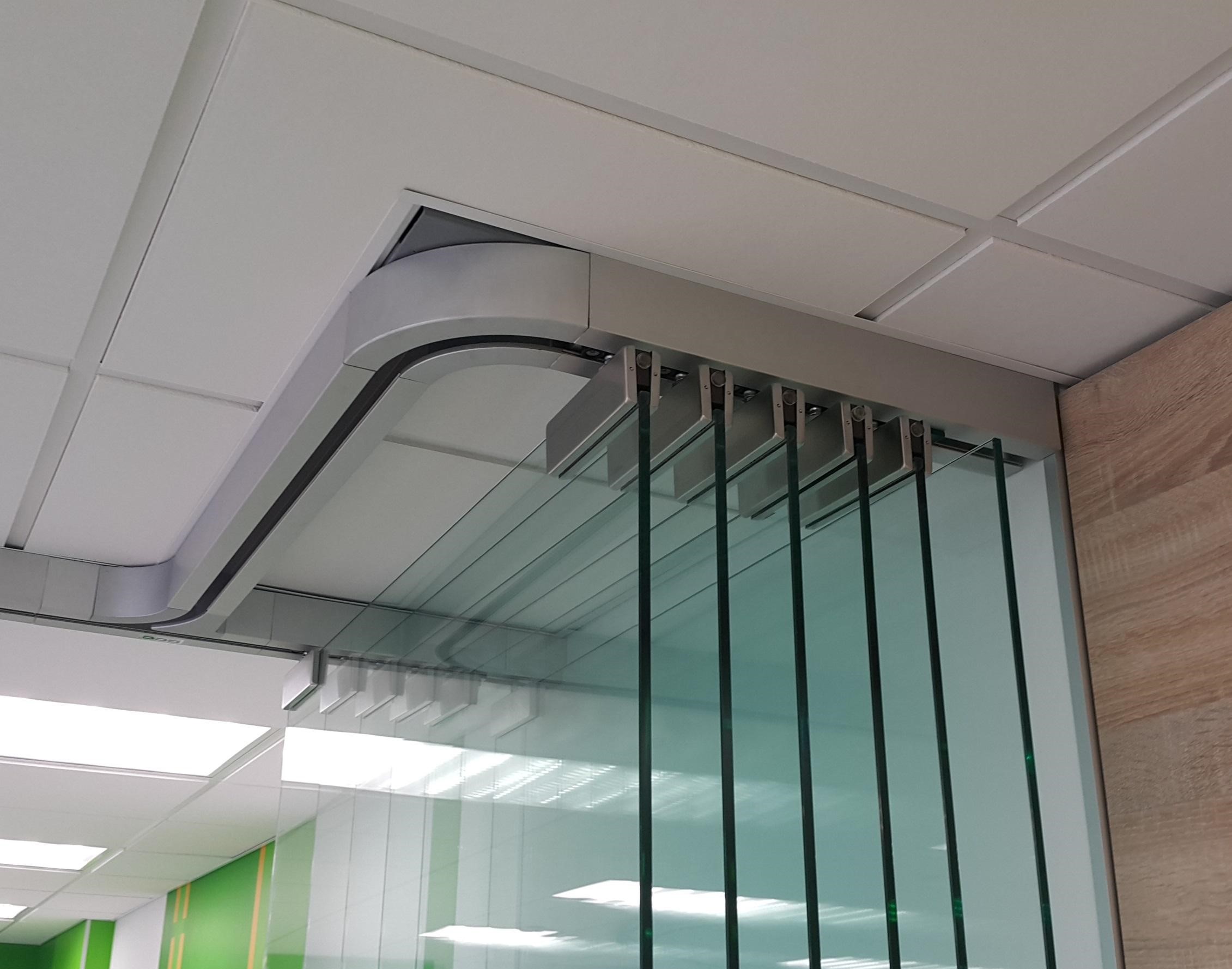 Конструкция перегородок состоит из набора стеклянных полотен, которые по желанию могут быть собраны в так называемую “парковочную зону”. Стекла при помощи роликовых кареток подвешиваются в верхний направляющий трек и перемещаются по этому треку в зону “парковки”. Низ стекол фиксируется при помощи специальных замков непосредственно в пол. В трансформируемые перегородки возможно встроить одно-, двухстворчатые маятниковые двери. Видимые алюминиевые части конструкции могут быть окрашены в любой цвет по шкале RAL.